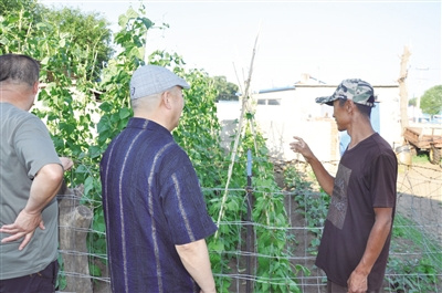 沙日格臺嘎查脫貧戶華成林(右一)向幫扶隊員介紹蔬菜種植情況。