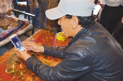 山南市乃東區扎西妥門社區群眾洛桑正在社區茶館里通過手機無線網絡與在江蘇上學的女兒視頻通話。本報記者 劉楓 攝