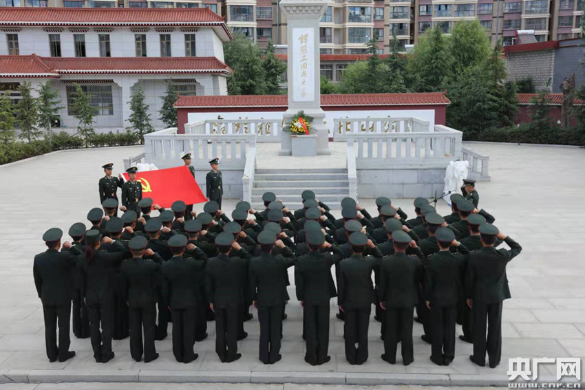 圖為官兵在先烈墓碑前面對黨旗進行宣誓(央廣網發 通訊員供圖)