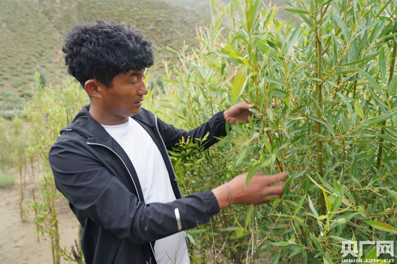 苗圃主人扎西班旦正在查看這片已有3年樹齡的竹柳苗的生長情況(央廣網(wǎng)發(fā) 王宇 攝)