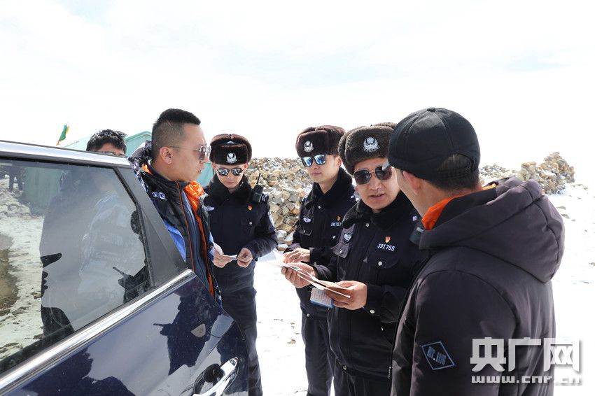 索朗達(dá)杰(右二)帶領(lǐng)民警對(duì)進(jìn)入轄區(qū)車輛和人員進(jìn)行檢查。(央廣網(wǎng)發(fā) 通訊員供圖)