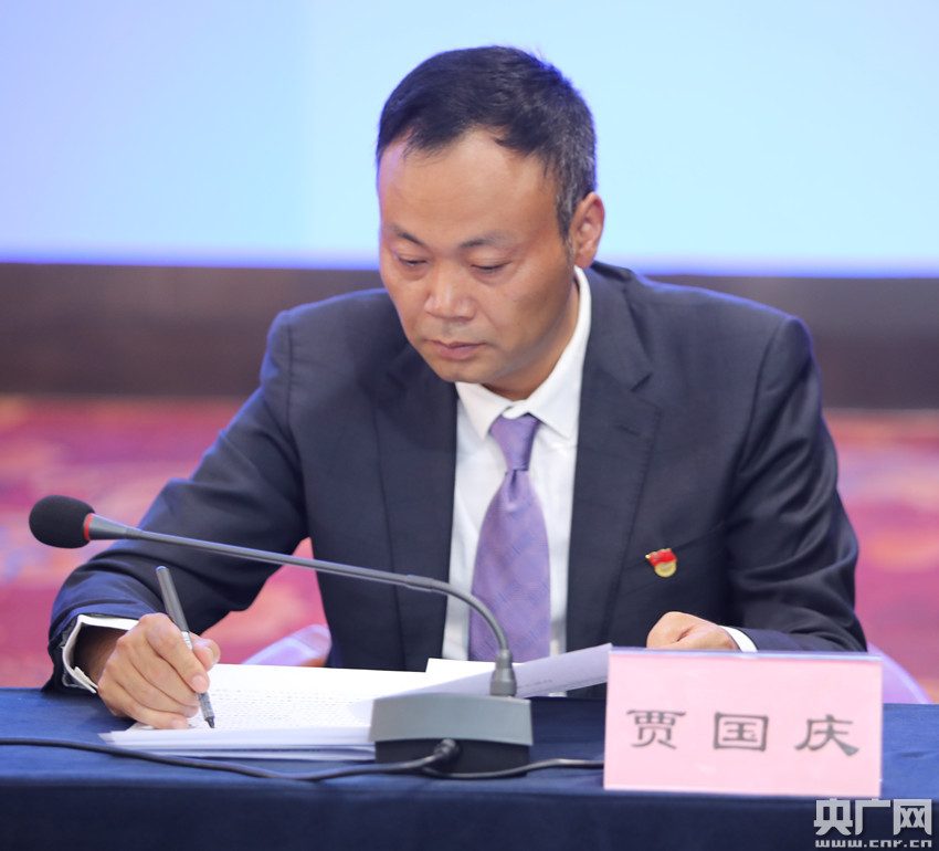 昌都市扶貧辦黨組成員 副主任賈國慶介紹脫貧攻堅工作情況(央廣網(wǎng)記者 普布次仁 攝)