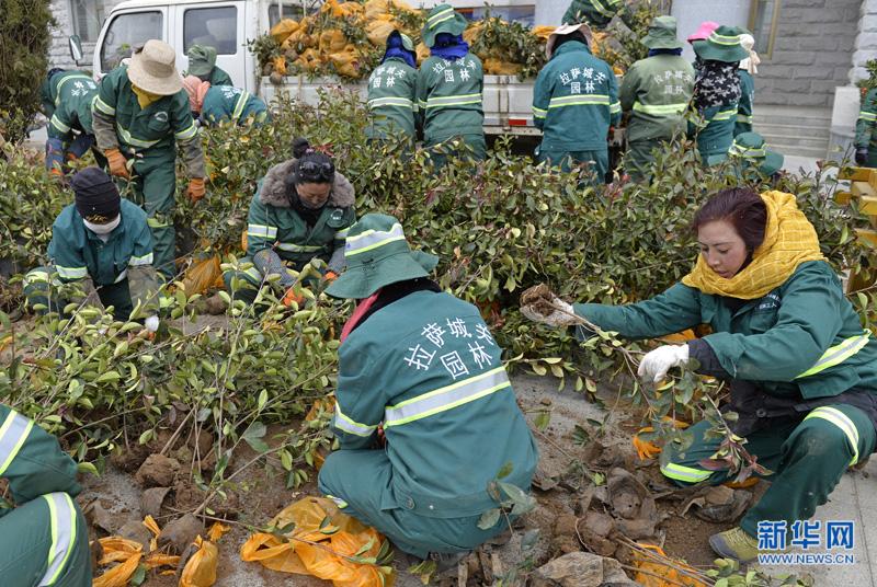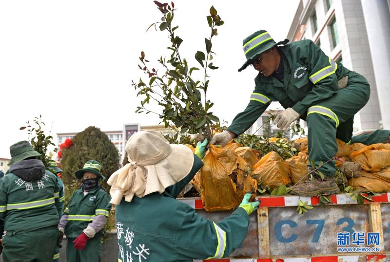 • 3月11日,拉薩市城關區潔達園林公司工人在搬運紅葉石楠苗木。新華社記者劉東君 攝