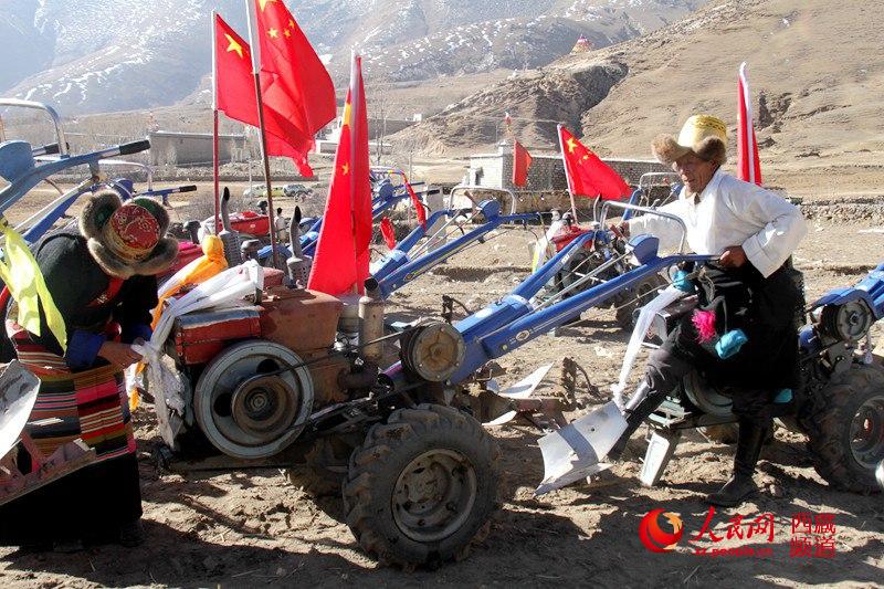 3月16日,西藏拉薩市娘熱鄉加爾西村舉行春耕春播。圖為村民在拖拉機掛上“吉祥哈達”。吳雨仁 攝