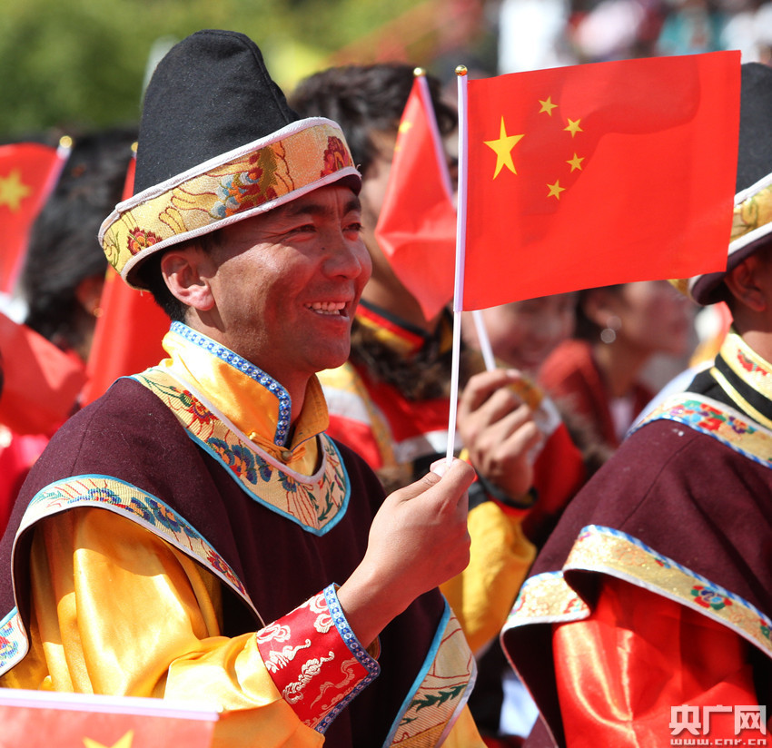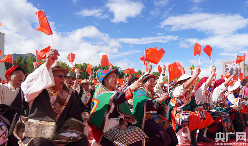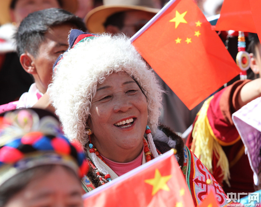 來西藏各地的群眾代表聚在一起,表達對祖國的摯愛與祝福。(央廣網記者 普布次仁 攝)