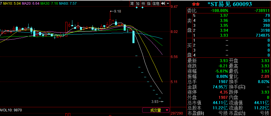 央廣網昆明7月17日消息(記者馬智波)7月16日,*ST易見(曾用名:易見股份)迎來復牌后第八個跌停,跌幅為5.07%。易見股份在4月30日停牌,停牌前連續三個交易日跌停,跌幅10%。從復牌前到現在,已經連續11個跌停,以4月27日收盤價8.13計算,其股價跌幅已經達到51.6%。