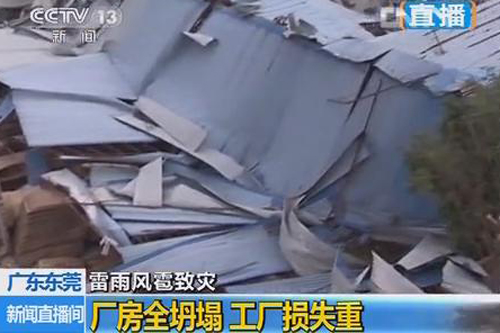 廣東東莞雷雨風雹致災:記者探訪沙田受災嚴重的紙箱廠。