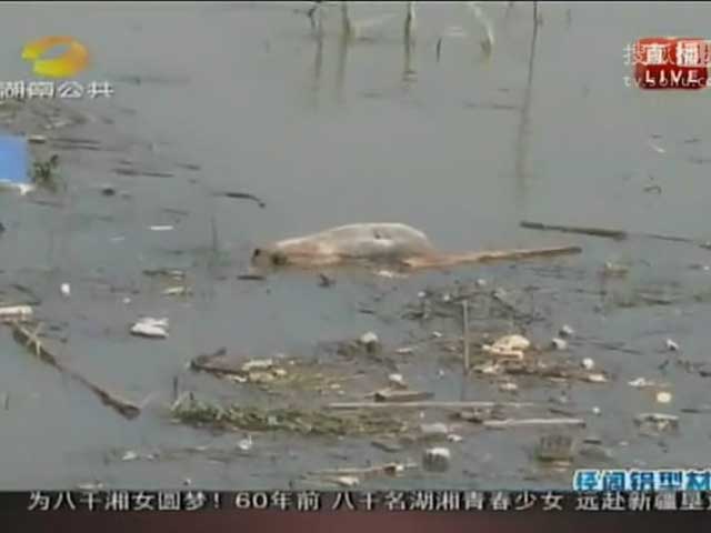 瀏陽河漂浮死豬 兩小時打撈數(shù)十頭