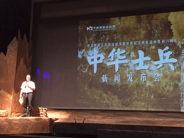 為紀念中國人民抗日戰爭暨世界反法西斯戰爭勝利70周年,中國國家話劇院出品及演出,馮俐編劇、查明哲導演的原創大戲《中華士兵》經過前后近三年的籌備、文本八易其稿,近兩個月艱苦排練,前后多日舞臺機械和多媒體聲光合成,日前在中央戲劇學院實驗劇場進行內部試演。48名演員在兩個半小時的時間內恢弘地全景再現了中國人民抗日戰爭時期全民抗戰的英雄史詩,塑造出中國人高貴的英雄群像。《中華士兵》區別了以往藝術作品對于抗戰的表現,立視角之新、拓格局之寬、描細節之深、塑人物之豐,可謂空前。