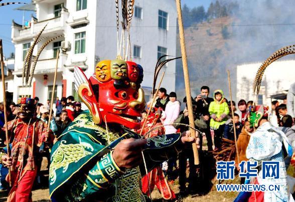 2月9日,鄉村藝人在江西省婺源縣秋口鎮長徑村表演跳儺舞。當日是大年初二,江西省婺源縣秋口鎮長徑村表演請儺神、跳儺舞的儺事活動,吸引了眾多鄉親和游客觀看。婺源儺舞俗稱“鬼舞”或“舞鬼”,極具地域特色,早在明代初葉就有記載。每逢新春,當地都會請儺神、跳儺舞,祈盼風調雨順、五谷豐登。 新華社發(胡敦煌 攝)