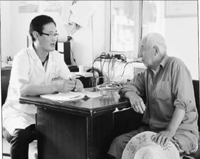 11點,上午的病人終于看完。施震林伸伸腰,趴在桌子上休息5分鐘后,又拿起了血壓監測儀,準備動身!鞍从媱潱裉煲ド锨f村!笔┱鹆终f,“最近天氣太熱,村里有幾位老人身體不好,我過去看一下!