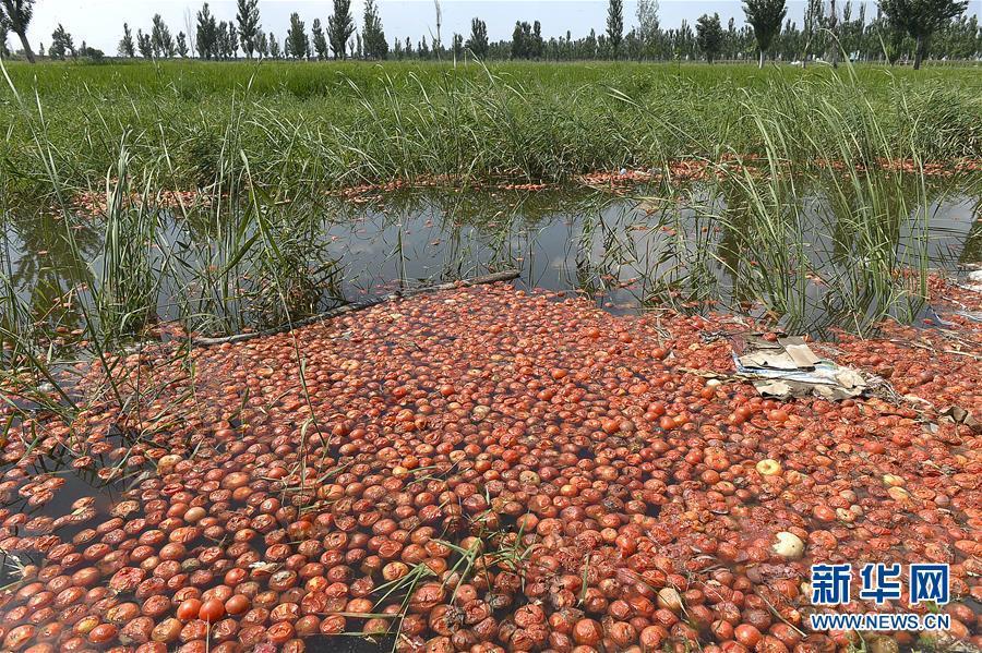 在寧夏靈武市梧桐樹鄉(xiāng)陶家圈村,田邊的溝渠內(nèi)密布著農(nóng)戶因?yàn)闇N而傾倒丟棄的西紅柿(8月2日攝)。