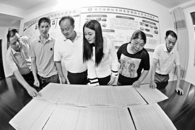 湖南省資興市是全國農村集體產權制度改革試點縣市。新民農村集體股份合作社成立于2015年2月,將資興市唐洞街道新民社區的農村集體資產全部實行股權量化到人,以戶為單位登記并設立股權賬戶,發放股權證,2016年1月底實現第一次分紅。圖為9月28日,村民正在查看、核對股權分紅相關信息。朱孝榮鄧劍峰李鐵南攝