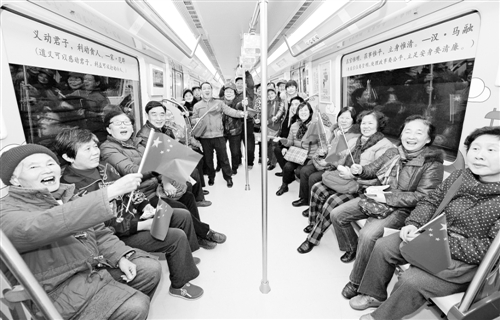 12月15日,安徽合肥軌道交通1號線列車車廂內,來自瑤海區(qū)勝利路街道一號線沿線搬遷居民在體驗軌道交通。當日,安徽首條地鐵線路——合肥軌道交通1號線啟動20萬人大型免費試乘體驗活動。這是一條縱貫合肥市南北的線路,將于12月26日正式開通運營。 張大崗攝