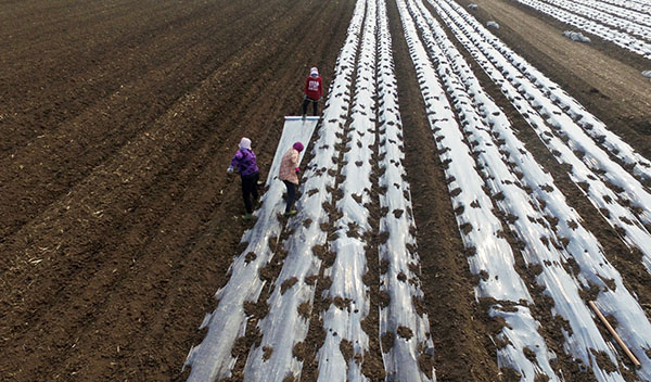 2月19日,在山東省郯城縣民樂種植農(nóng)民專業(yè)合作社種植基地,工人為種植的土豆覆膜。
