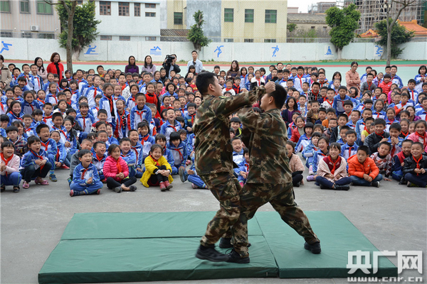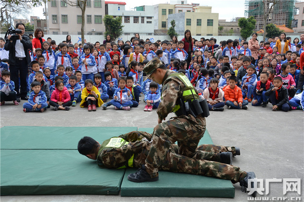 汕頭市云澳中心小學的學生們目不轉睛地看著汕頭邊防的武警學員演練抓捕術。辛雄發 攝