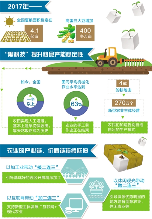 今年全國夏糧面積穩(wěn)定在4.1億畝,高蛋白大豆增加400多萬畝。糧食產(chǎn)能穩(wěn)定離不開播種面積,更離不開節(jié)水節(jié)肥的“黑科技”。如今,全國一半以上農(nóng)田實(shí)現(xiàn)人工灌溉,基本上是旱澇保收田,靠天吃飯正成為歷史;田間平均機(jī)械化作業(yè)水平達(dá)到63%,農(nóng)業(yè)的手工勞作史正在結(jié)束;4成耕地由270萬個(gè)新型農(nóng)業(yè)主體經(jīng)營,農(nóng)民們加速告別自給自足的生產(chǎn)模式。科技浪潮澎湃,我國農(nóng)業(yè)正面臨千年未有之變局。