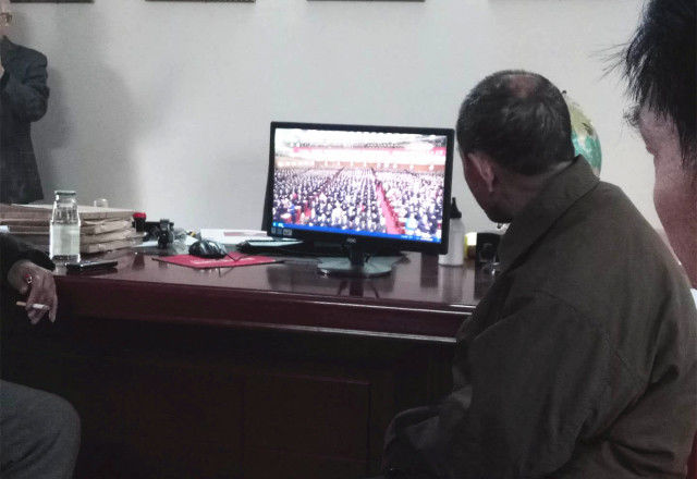 遼寧省鞍山市臺安縣西佛鎮西佛村村黨支部全體黨員一起看十九大開幕會。(攝影:中國鄉村之聲農民觀察員竇亞強)