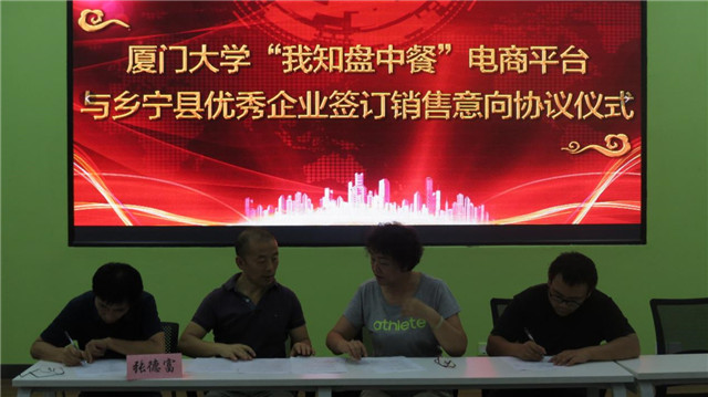 會議最后進行了鄉寧各企業和“我知盤中餐”平臺的簽約儀式。張教授和廈門大學鄉寧實踐隊的努力以及“我知盤中餐”平臺所體現的“精準扶貧”的理念讓各位企業代表與電商精英看到了美好的合作前景,一共有5家企業和電商與“我知盤中餐”平臺簽訂了合作協議。