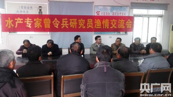 中國水產科學研究院長江水產研究所研究員、水產養殖專家曾令兵(左一)和養魚戶互動交流。