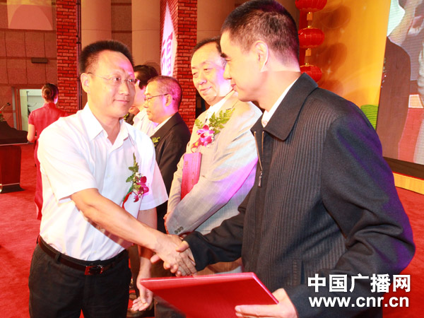 中央人民廣播電臺中國鄉村之聲開播儀式今日在北京舉行,圖為中央人民廣播電臺副臺長趙子忠(左)為中國鄉村之聲專家顧問團代表頒發聘書。