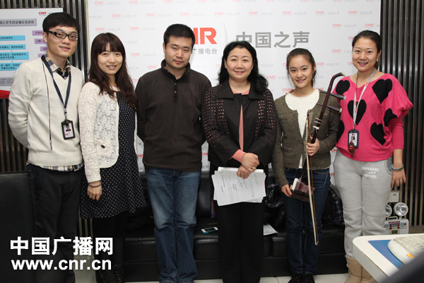 本期《中國大舞臺》節目嘉賓中央音樂學院附中校長娜木拉(右二),從附中走出的青年鋼琴家王笑寒(左二),附中高三學生章海玥(左一)與主持人胡凡交流(中廣網記者涂傲攝)