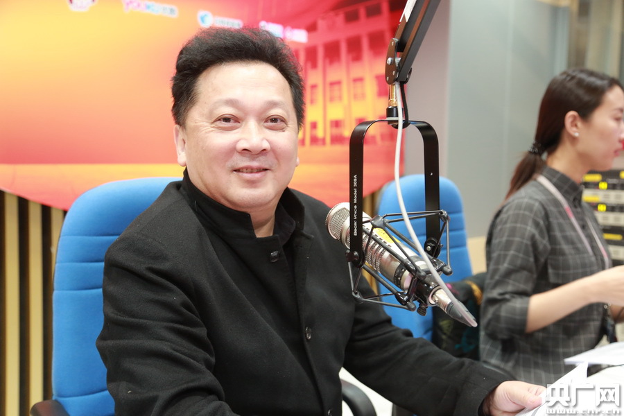 中國文聯演藝中心主任、全國政協委員、著名軍旅歌唱家、中國文學藝術界2016春節大聯歡——《百花迎春》總導演郁鈞劍做客中國之聲《中國大舞臺》(央廣網 李聰格 攝)