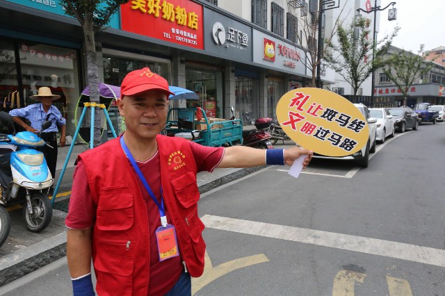 新市鎮(zhèn)交通志愿者手持小旗引導行人、非機動車有序通行