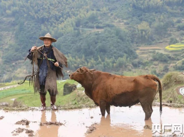 在春耕現場,開犁之前,村里的村民要用包著松樹針葉汁的糯米麻糍去喂牛,意思是“開犁祭牛”。“這樣做一方面給牛加力以示酬謝,一方面預兆今年農作物大豐收。在‘開犁祭牛’后,還要用牛拉犁開始耕田翻土。等犁好田,我們還要繼續用牛拉耖去平整新翻的泥土,為播撒谷種做準備。平整好后,再用四齒耙糊好田埂,以便加固防漏”,當地村民向記者介紹道。