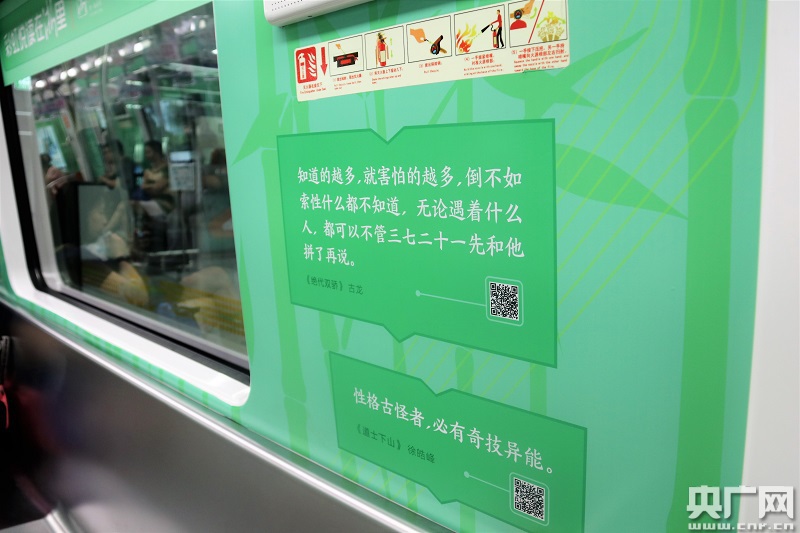 上午10點45分,陳先生帶著放暑假的兒子在慶春廣場地鐵站,坐上了彩虹悅讀列車。走進車廂,濃濃的閱讀氛圍撲面而來,車廂內印著一段段精選書摘,有選自錢穆先生《中國歷代政治得失》的“講歷史,更可叫人不武斷。因事情太復雜,利弊得失,歷久始見,都擺開在歷史上”;有摘自古龍《絕代雙驕》的“知道的越多,就害怕的越多,倒不如索性什么都不知道,無論遇著什么人,都可以不管三七二十一先和他拼了再說”;有選自東野奎吾《惡意》的“令他害怕的,并非暴力本身,而是那些討厭自己的人所散發的負面能量。他從來沒有想象過,在這世上竟然會有這樣的惡意存在”;還有選自加西亞·馬爾克斯所著《霍亂時期的愛情》的愛情告白:“愛情是一種本能,要么第一次就會,要么就一輩子也不會”等等。