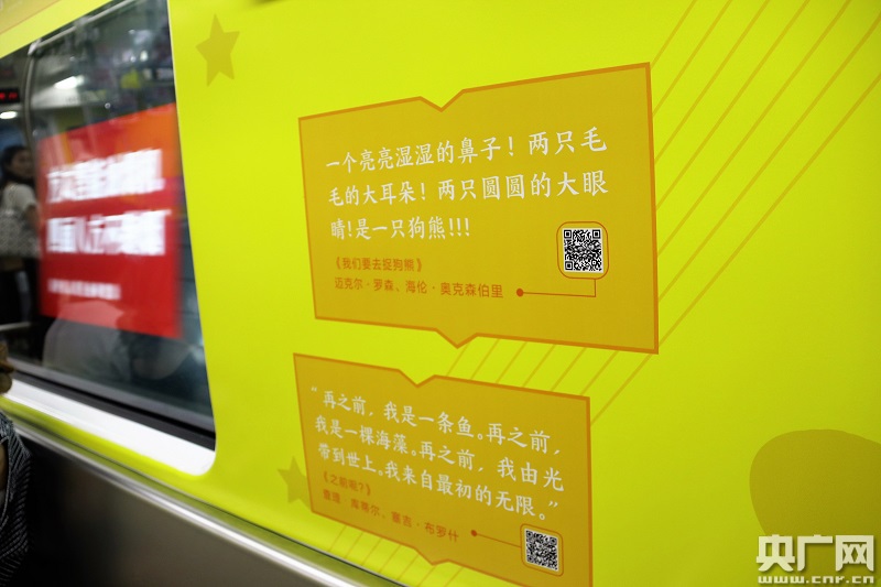 陳先生笑著說:“這輛列車很新鮮!以前一坐地鐵就拿出手機看,現在地鐵上的文字吸引了我們的注意力,營造這樣的閱讀氛圍,對于孩子來說意義很大!钡罔F工作人員告訴記者,彩虹悅讀專列每天共有14趟,從6:23到19:27,坐2號線的市民朋友都有機會偶遇“書香列車”。
