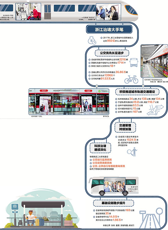 大力治理交通擁堵,加快公交、地鐵設施建設,是2017年浙江省十大民生實事之一。一年多來,杭州地鐵2號線全線貫通,4號線南段開通,地鐵網骨架基本搭建完成,日均客流量超過120萬人次。在交通運輸部剛剛發布的報告中,杭州已從上一年的“中國堵城第8位”迅速下滑到第48位。