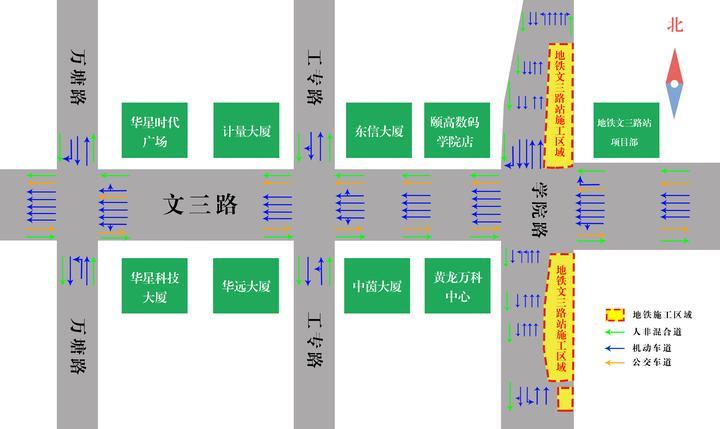 文三路站交通組織:學院路沿線機動車道北口雙向4車道,南口北向南1車道+南向北3車道;學院路文三路口北口2進3出,南口4進1出;文三路車道保持現狀,華星路恢復雙向通行(華星路北側86個泊車位取消,南側50個泊車位取消7個)。