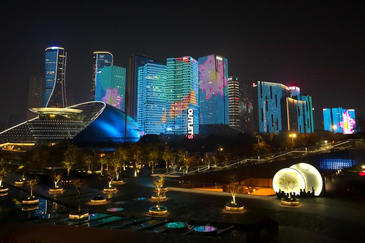 市錢江新城管委會在原有燈光秀的基礎上對城市陽臺景觀照明系統進行有針對性的優化、升級,打造一臺獨具杭州韻味的“互動光影秀”。