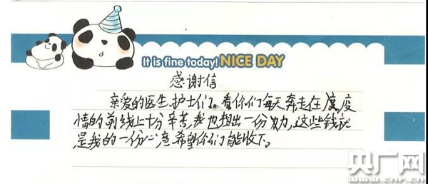 打開卡通信封,9張100元5張20元的人民幣整整齊齊地疊放著。一起放在里面的,還有一封言辭樸實而動人的感謝信。原來,小男孩想要感謝在一線抗擊疫情的浙大一院工作人員。“親愛的醫生、護士們。看你們每天奔走在疫情的前線上十分辛苦,我也想出一份力,這些錢就是我的一份心意,希望你們能收下。”