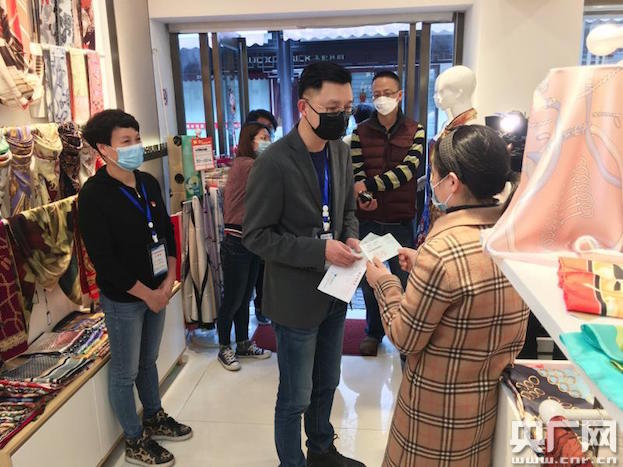 在對杭州新潔繡絲綢有限公司、杭州儲秀紡織品有限公司等率先申請的4家絲綢企業進行核對后,2月25日下午,長慶街道辦事處主任、杭州中國絲綢城管委會主任袁俊第一時間來到商鋪,為企業送上了復工“大禮包”。