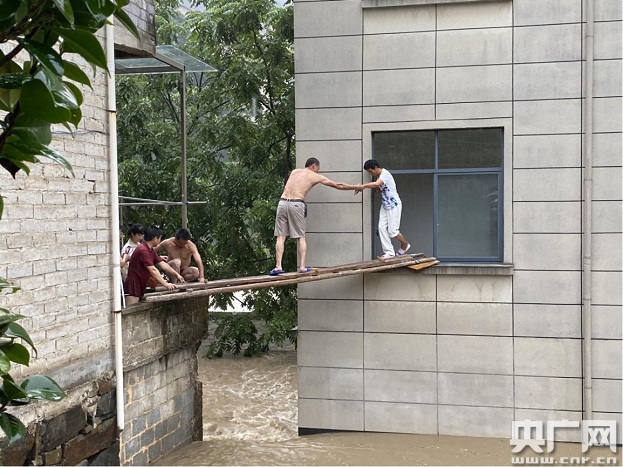 “抓住我的手!慢點走!”8點55分,在宋村鄉鏡洪村,村干部架起一座簡易橋,接出了被洪水困在家里的農戶張中華。原來,張中華的房子地勢比較低,早晨一覺醒來就發現被洪水包圍了。鄉里包村干部和村里干部獲悉后,迅速抵達現場接應。很快,村書記張三木和村委主任張紅鳳找來幾根木頭,大家在隔壁房子里架出一座橋,搭在張中華房子的窗戶口,幾名熱心的村民更是光著膀子上陣攙扶,最終將張中華接出了被困房屋。
