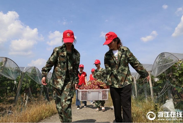 8月10日,湖州市吳興區埭溪鎮的一處葡萄園里,來自鎮機關團委、婦聯的10多位黨團員志愿者在幫果農搶收葡萄。7月下旬以來,果農種植的葡萄進入豐產期,但面臨采摘、銷售難題。該鎮團委、婦聯和電商服務中心等多部門伸出援手,不僅聯系客戶到葡萄園收購,還通過各種平臺,及時為果農發布銷售信息,解決葡萄銷售問題。(浙江在線拍友 鄧德華 攝)