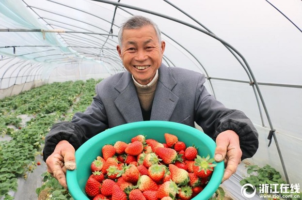 1月17日,湖州許溇村,今年的頭茬大棚草莓已進入初果期,果農忙采摘,商販忙銷售,頭茬草莓搶“鮮”上市。(浙江在線拍友 朱偉良 攝)