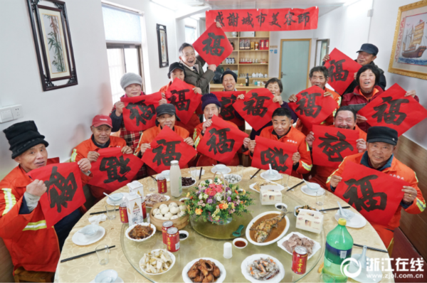 1月29日中午,在寧波江北區洪塘鞍山村北山人間農家樂,30位負責報國寺周圍保潔的環衛工人歡聚一堂,這些來自河南、安徽、山東等地的新寧波人,舉杯歡慶即將到來的新春佳節。該活動由鞍山村和社會力量協辦,以慰問和感謝“美容師”在過去一年里,不論風雨寒暑為周圍鄉村、景區美麗環境所付出的辛勤勞動。( 拍友 龔國榮 攝)