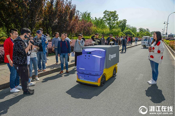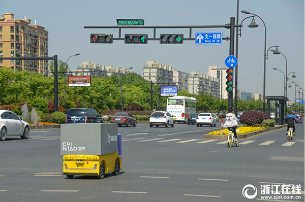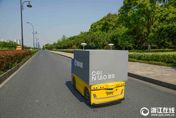 2018年4月18日,在杭州市文一西路上,一輛半人高的四方小車,在無人駕駛的情況下,一路停停走走,行駛在送快遞的路上。據了解,這是菜鳥旗下ET物流實驗室研發的無人車,正在進行路測。當日,在10公里的路測路段,無人車已經能夠完成內部的文件等收發配送。菜鳥無人車定位在末端配送,車速最高控制在15km/小時,車輛制動距離可以控制在0.5——0.3米。菜鳥無人車量產商用在即,年內將全面進入末端進行配送。(記者 楊曉軒 攝)