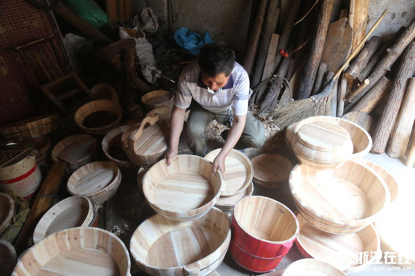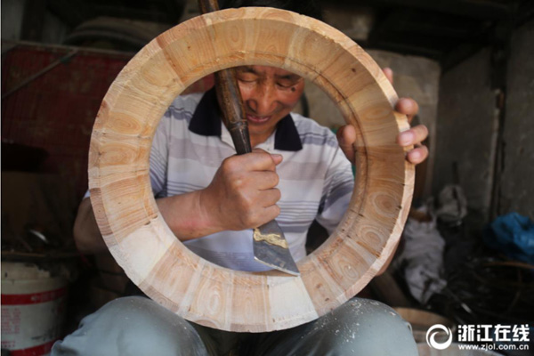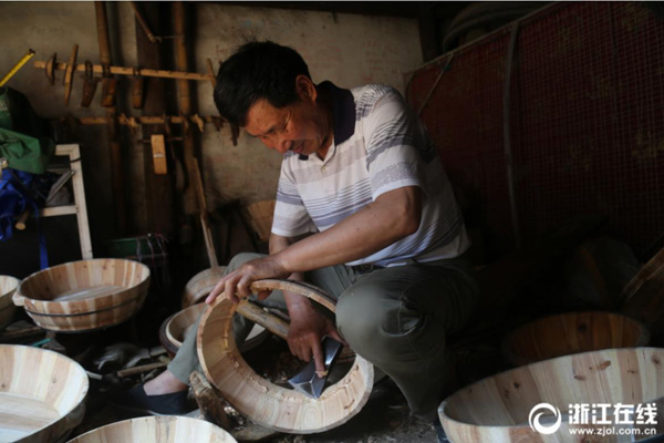 5月15日,在湖州市吳興區埭溪鎮茅塢街一條偏僻巷子里,上強村村民崔國良在箍桶,為山村一位即將出嫁的新娘制作精良的“嫁妝”。