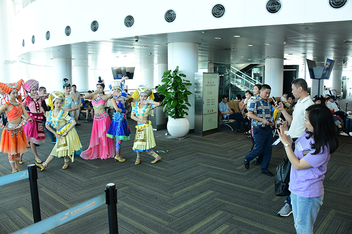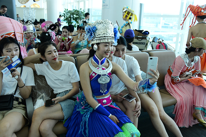 6月25日,在杭州蕭山國際機場的候機廳與杭州飛往桂林的航班上,上演了一場民族風的快閃活動。數十名美女帥哥們身穿民族服飾上演了一出“穿越大戲”,與乘客進行親密互動。