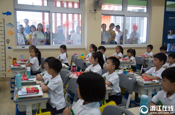 9月2日,杭州長江實驗小學開學,一年級生迎來小學第一堂課。教室內小朋友認真聽課,教室外窗口門框邊倚靠著很多圍觀家長。爺爺奶奶爸爸媽媽齊刷刷地簇擁在教室外觀望,時而拿出手機記錄孩子們的人生第一課。