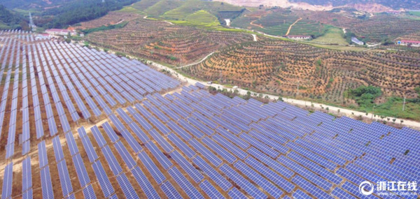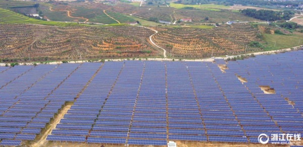 10月10日,湖州市吳興區埭溪鎮東紅村光伏發電項目。發電基地面積1400畝,原為廢棄多年的礦山。整個項目分兩期,目前一期700畝已經建成并網發電,千余村民每人每年因此增加1000多元的土地出租收入。(浙江在線拍友 鄧德華 何偉衛 攝)