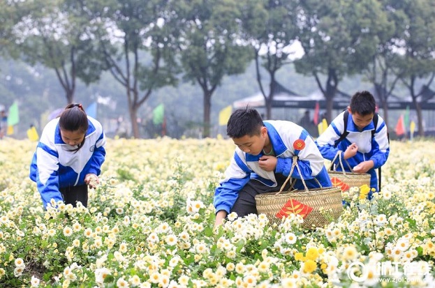 11月4日,桐鄉市石門鎮,不少家長帶著孩子在白馬塘村的菊海里挎著竹籃,體驗杭白菊采摘。(浙江在線記者 王志杰 拍友 沈怡華 攝)