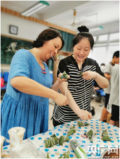 折葉、盛料、壓實(shí)、裹葉、扎繩……一雙雙忙碌的手穿梭在一張張翠綠的粽葉間,一道道工序有條不紊地進(jìn)行著,一片片清香的粽葉、一粒粒晶瑩的糯米,在同學(xué)們靈巧的手中翻轉(zhuǎn)飛舞,轉(zhuǎn)眼就變成了一個(gè)個(gè)誘人的粽子。