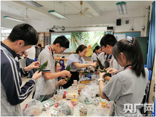在各班教室里,同學(xué)們或觀看圖片,傾聽家長(zhǎng)代表介紹端午的來(lái)歷及風(fēng)俗習(xí)慣,或三五成組,就端午節(jié)的習(xí)俗及意義展開游戲、知識(shí)搶答、詩(shī)朗誦等。本次活動(dòng)的重要環(huán)節(jié)是包粽子,各班老師、家長(zhǎng)代表現(xiàn)場(chǎng)指導(dǎo)學(xué)生包粽子,師生、家長(zhǎng)之間通力合作,完成了佳節(jié)美食的制作。