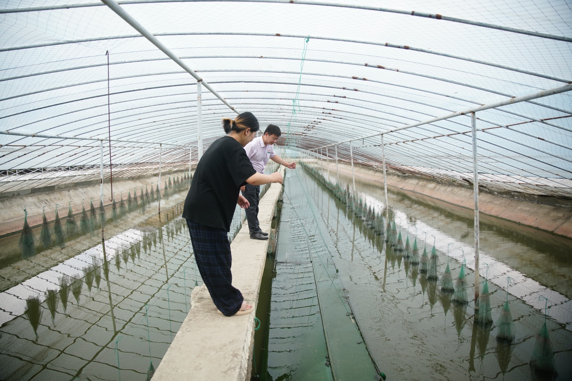 羿嬋娟在甲魚生態養殖大棚內查看甲魚苗狀態(央廣網記者 尚天宇 攝)