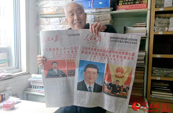 “從這些報道里,明顯能感受到在每一代領導人的帶領下,中國發生的天翻地覆的變化!崩先苏f著,舉起3月18日的《人民日報》。報紙頭版刊登了習近平當選國家主席、中央軍委主席的新聞!斑@些年來,我黨反腐倡廉和依法治國等工作開展深得民心,‘綠水青山就是金山銀山’理論也讓咱們老百姓生活環境越來越好,生活也越來越富裕。這次習近平當選國家主席是眾望所歸!崩先嗽俅温冻隽舜緲愕男θ荨